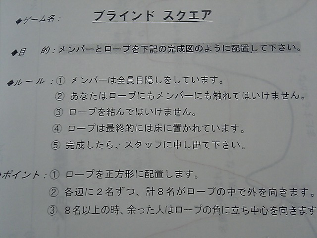 と言っても、アイマスクをしたメンバーをリーダー役の人が指示をして正方形を作る。というもの何ですがねww 目が見えないという不安をいかにして解消するのか?ということを知るためのゲームらしいです。そして不安にならないための答えは一方通行の会話をしないことだと分かりました。どういうことかというと一人が喋り続けるのではなく、お互いに意見交換をして会話をすることを心がけるということです。今回の場合リーダーが指示するだけではなく、アイマスクしている側も『今 自分がどういう状況にあるのか?』や『どのような役割をしているのか?』などということをリーダーに聞くべきだったのです。何だ感だ言っても